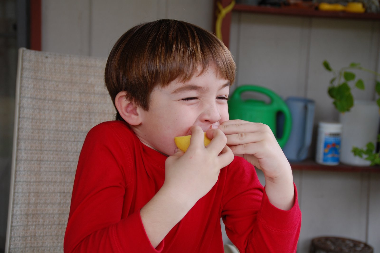 Gabe loves anything sour. He and our neighbor, David, were visiting over the back fence today